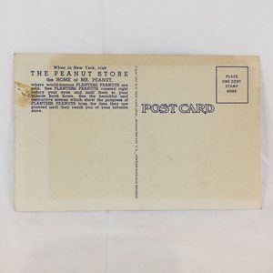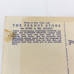 Planters Peanuts postcard. Unposted, linen. In overall good condition. The back has some discolouration with the paper it was up against and there is a stain on the edge, a sticky finger? There is no mustiness or smell. It came from the home of the original purchaser.
