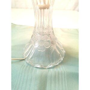 This beautiful vintage table lamp features a frosted white or clear glass base adorned with an embossed/painted Dogwood flower. The lamp likely dates from the Mid-Century period, often associated with Hollywood Regency or Shabby Chic/Cottagecore decor.