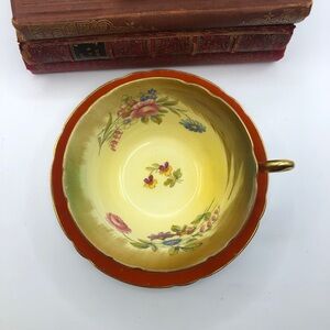 This exquisite Shelley tea cup and saucer display a colorful extravaganza of blooming summer flowers on a hazy sunny interior of the teacup. The bright burnt orange with gold accents makes this set truly unique and delightful.