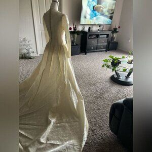 Measurements are 30” Waist, Seam below waist 34”, Shoulder to front length 52”, Sleeve length 24”, Breast 36 “, Train from shoulder to longest point approx 100”