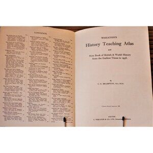 This vintage school Atlas is, "History Teaching Atlas: and Notebook of British and World History from the Earliest Times to 1938", by C. K. Brampton, published by A. Wheaton & Co. in 1955. It has blue cloth soft covers with red and black lettering and graphics on the front cover. It has 67 pages of maps in color depicting population, politics, ancient civilizations, routs of explorers, climate, etc. in addition to geography, and an Index.