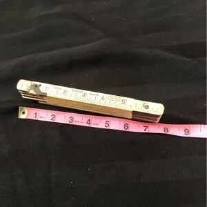 Super funky and retro folding ruler. Folds out to 72” in length. Metal clip on each end can fold down to hold the ruler in place (like a cabinet edge).