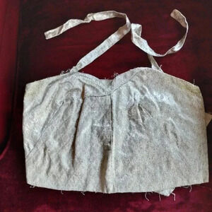 Custom made, has at some point been taken apart and remade. The bustier shows far more evidence of this. It was probably a dress originally. The skirt is lined part way down.