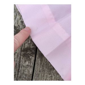 Pink babydoll pleated satin fabric (polyester?Nylon?). White floral embroidery panel to center front dress. Peter pan collared neckline. Rear metal zip closure. 6 discolor markings shown in photos, currently untreated. No holes. Pet and smoke free studio.