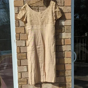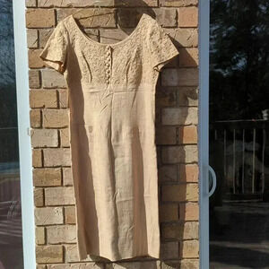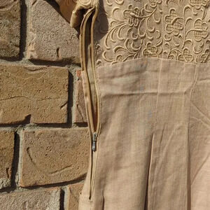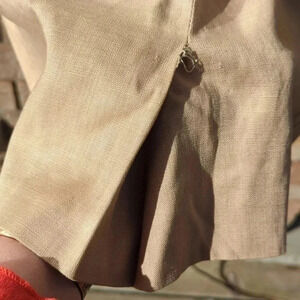 Professionally hand tailored, probably in Toronto. Made of a heavy weight linen. embroidered top with covered buttons. Accents also include fake pockets to accentuate the hips. There is some staining in the pits, but it's not very noticable due to similarities in the colour of the fabric. Linen is generally considered easy to wash sweat out of. There is a side zipper on both sides. They both are stiff but functional. There are a couple of spots I noticed that the seams have opened in the pit and the top of one zipper. The seam at the top of the kick pleat has had stress applied to it and some of the seam (not the fabric) has ripped. I was the last person to wear this when I was a teen/early 20's. It probably has not been cleaned since the 60's. I don't know anything about cleaning old fabrics and so I won't touch it.