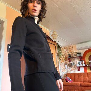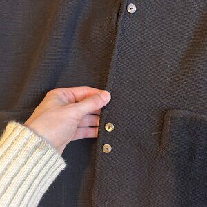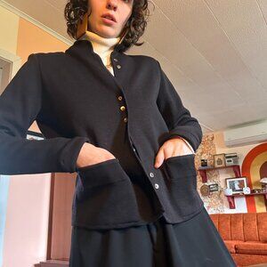 1950s Pure virgin wool Brigus Knitting Mills black fully-fashioned blazer! So, this blazer could potentially be from the early 1960s, but due to the European influences and slow adoption of fashion on the island, this is made from patterns of 1950s blazers. Brigus Knitting Mills was part of Newfoundland's first premier's (Joey Smallwood) initiative to industrialize Newfoundland to keep up with the modernization of our new confederation with Canada. Unfortunately, many of the businesses and factories that Smallwood helped build at the time did not stay open for very long, but some beautiful fully-fashioned pieces such as this blazer still remain! It is made of pure virgin wool imported from Austria! It features a band collar and a unique thriple button pattern, with cuffed sleeves!