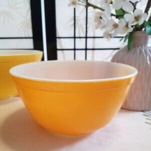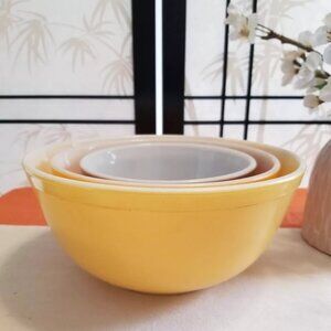 Add a pop of color to your kitchen with this vintage Pyrex Nesting Mixing Bowl Set. Made in the mid 20th century, these original three-piece bowls come in daisy yellow, citrus orange, and brown. Each bowl is solid in pattern, round in shape, and made of break-resistant and stackable glass. These decorative bowls are not only stylish, but also practical. They are oven safe and perfect for all occasions. The glossy finish and fused glass production technique make them a unique addition to your pottery and glass collection. The backstamp is impressed and the production period was from 1950-1959, making them a true mid-century modern gem.