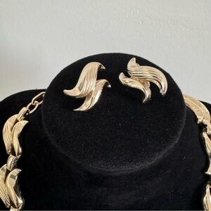 1950s Signed Coro Set (Gold Tone Necklace + Clip on Earrings) Bib Choker Collar