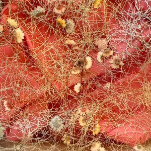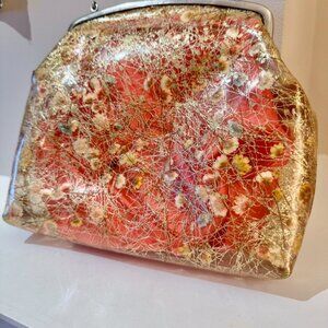 1950s vintage vinyl handbag, gold-tone frame with a kiss-lock closure and a lucite handle. Gold thread and small pressed dried flowers on the interior of the vinyl. The interior fabric is a bright coral satin. The clear vinyl exterior shows some wear and surface scratches, there is a break in the plastic on one side at the top below the opening of about a cm, as shown in photo 10. Tear to lining shown in photos 11 and 12, this can be repaired but I am unskilled at sewing and as I only trust myself at the basics I am not attempting this and ruining it! Measures L: 9 inches W: 2 inches H: 8.25 inches, handle drop is 4.5 inches. Cat friendly, nonsmoking home.