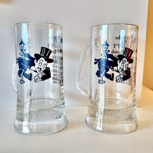1950s humour barware beer steins, set of two. Clear glass with black writing and art, typical for the time and also retro for them! Used to have a gold trim but has worn away over the years, otherwise in great vintage condition. They measure just under 6.5 inches tall and the opening circumference is 3 inches. Cat friendly, nonsmoking home.