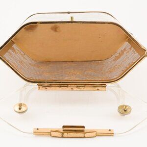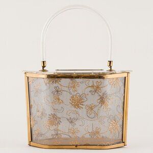 1950s Vintage "Majestic" Lucite & Gold Floral Lace Top Midcentury Handle Box Bag