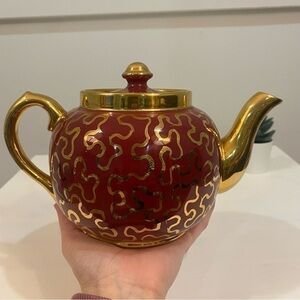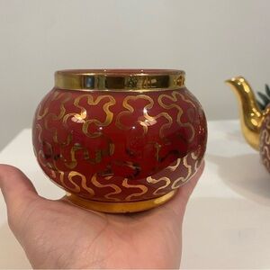 Vintage mid-century 1950s English tea set burgundy / cranberry red with gold trim and squiggles. Tea pot, cream and sugar dish.