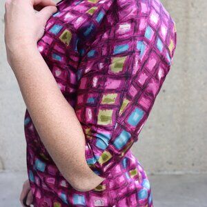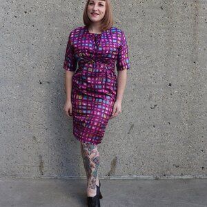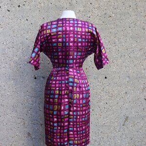 1950s bombshell wiggle dress with a matching cropped jacket. Such an iconic 50s cut and silhouette, in a very unexpected colour and pattern. It has really flattering gathering along the best line, a slightly wider neckline, and the jacket has a bit of a raglan sleeve.