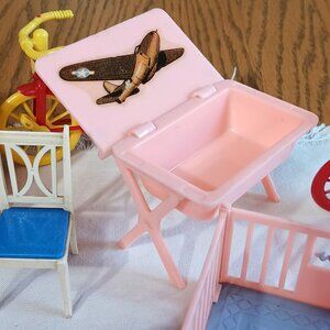 1950's to 1960's Reliable Toys Doll House Furniture. Made in Canada. Overall very good vintage condition. Baby doll bath/changing table opens to reveal decal of airplane. Rolling tea cart opens/lifts on both ends. School desks backs open & seats fold upwards.