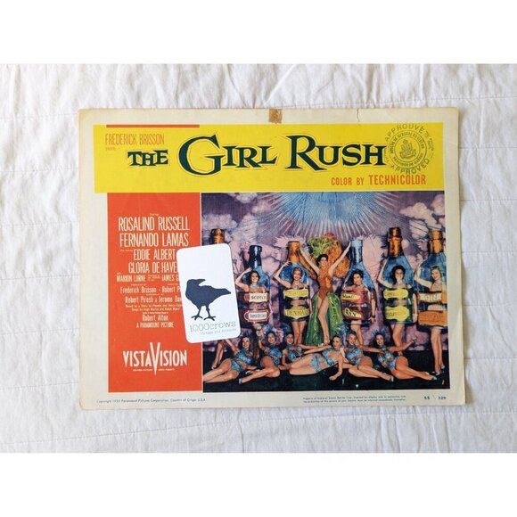 An original vintage lobby card for "The Girl Rush", a 1955 movie by Paramount color by Technicolor, with a wonderful film still of the girls lined up a bottles on a glitzy stage! This poster was used in Canada, Quebec as can be see on the censorship (approved) stamp.