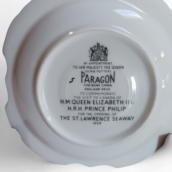 Celebrate history with this charming Paragon commemorative plate marking the 1959 opening of the St. Lawrence Seaway by HM Queen Elizabeth II and HRH Prince Philip. Made in England from fine bone china, this petite keepsake plate measures approximately 4.5" across.
