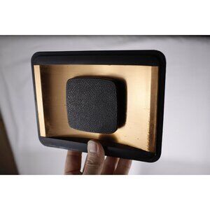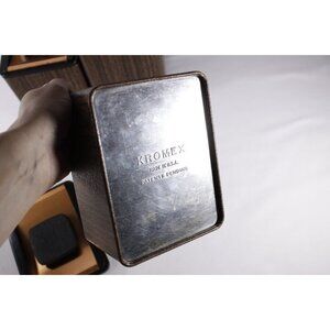 A set of 3 vintage Kromex kitchen canisters dating ca 1960-1970s. The outside in a plastic-feeling faux woodgrain, the lids in a black plastic with copper inset. The 2 smaller tins with a flower pattern to the front. In decent condition with marks, stains and scuffs to the lids, The smallest container with a discoloration stain on the bottom. Marked underneath KROMEX Made in USA Patents pending.