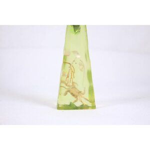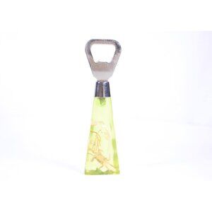 A bright green acrylic or lucite handled bottle opener, with a couple of small shells and a real little crab encased in the plastic. The plastic surface looks a little foggy and there is a glue drip mark running down. Otherwise only small marks of age and use.