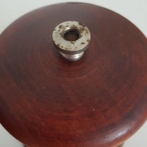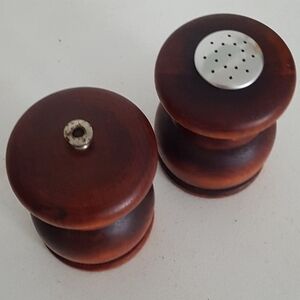 Beautiful turned Canadian maple stained teak in fantastic condition. All parts work. There is some wear to the metal finish on the top of the pepper mill as seen in the photos.