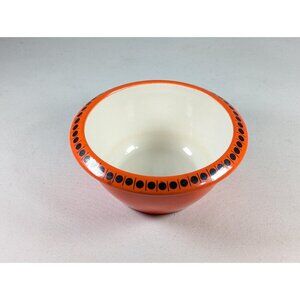 A bright orange Oven proof dish, made in Japan. The inside and bottom have been left white, and the edge has been decorated with a simple geometric circle and line pattern. A good size for a single person serving, cute as a breakfast bowl, or why not have it as a (Halloween themed) pet dish?
