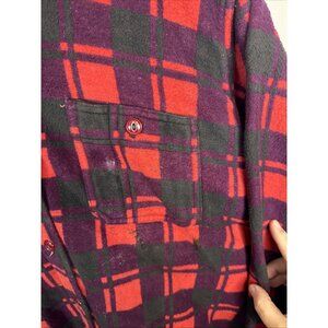 Thick 60s Champion flannel in classic red/black/purple plaid. Heavyweight, soft, and warm with two chest pockets. Authentic mid-century workwear piece. Multiple marks, paint spots, and wear throughout (see photos). No major holes. Perfect for collectors, vintage workwear, or grunge styling.