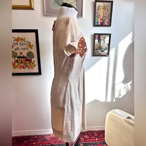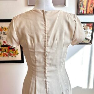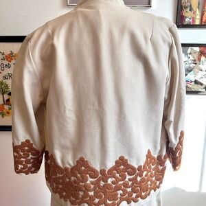 Chic mid-century elegance meets mod detailing in this 1960s cream dress and matching jacket set. The short-sleeve, square-neck shift dress features a rust-toned embroidered floral scroll panel across the bust, finished with a sweet bow accent at the empire waist. The coordinating open-front jacket echoes the embroidery along the hem and sleeves, creating a perfectly matched look.