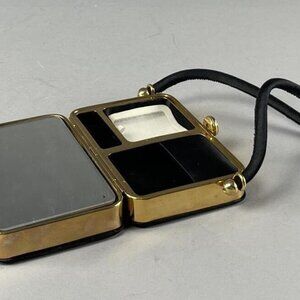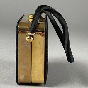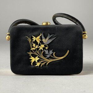 Experience the fusion of art and functionality with this exquisite est. 1960s Minaudiere Box Purse Compact. Lined in elegant black cloth, this handcrafted treasure features intricate metal designs of flowers and birds, epitomizing mid-century craftsmanship. Its compact form makes it not only a functional accessory but also a remarkable piece of art.