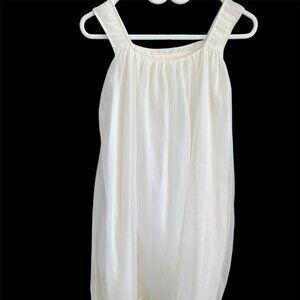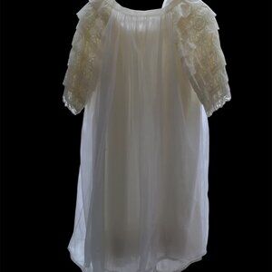 THIS FLOWING VINTAGE NIGHTGOWN 2 PIECE SET | ROMANTIC LINGERIE IS IN AN IVORY COLORED CHIFFON). THE SLEEVES ARE CONSTRUCTED OF LAYERED LACE AS IS THE NIGHTGOWN HEMLINE.