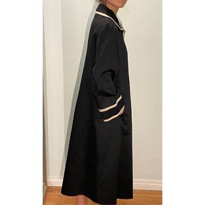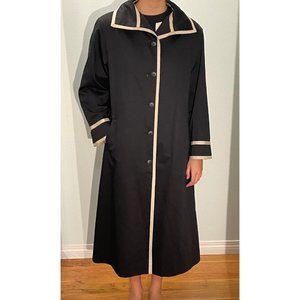 Long cotton lined black coat with beige trim.