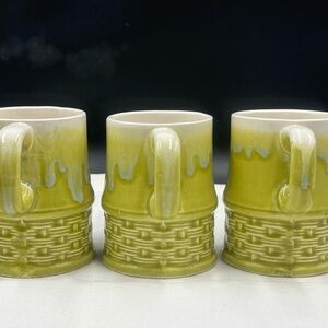 During the 1960s, Japan became renowned for producing high-quality ceramics that fit the sleek, modern aesthetic of the time. Japanese pottery from this era often combined traditional techniques with bold, contemporary designs to appeal to the Western market. The distinctive green drip glaze seen in this set is a hallmark of mid-century Japanese artistry, reflecting the era’s trend of organic forms and natural textures. The basketweave base adds a tactile element, enhancing its visual appeal while emphasizing the craftsmanship behind each piece.