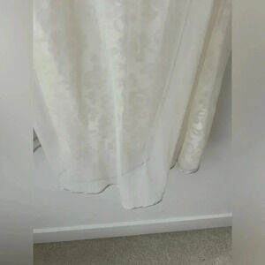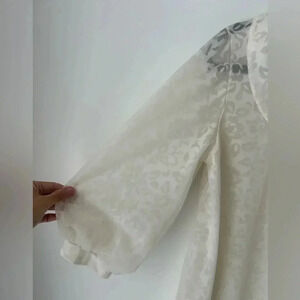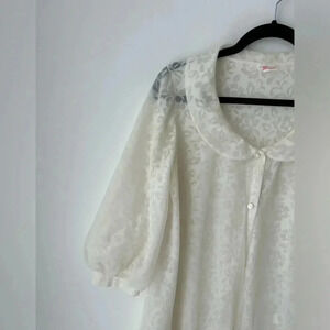 The sweetest chiffon duster with large puff-sleeves decorated with lace. It has a two layers of chiffon with a Peter Pan style collar trimmed in lace that continues along the front 2 buttons opening. Wear indoors or out, because this beauty deserves to be seen.