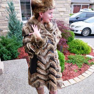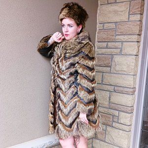 Chevron patterned mid length real fur and leather from the 60s or 70s. Fur appears to be raccoon or coyote.