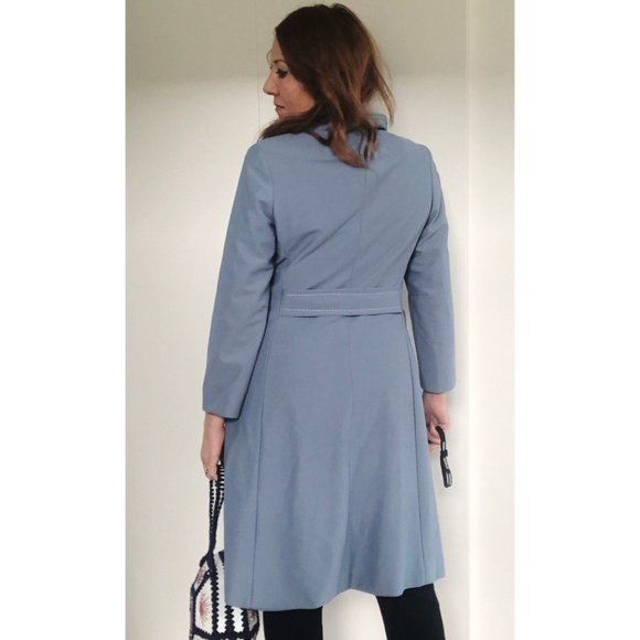 Gorgeous vintage coat in near pristine condition. Lovely shade of blue-grey with interesting blue/gold buttons and silky lining. Pockets, back belt detail. Approximately a US size 9-10. For reference, human model is 5'7", dress size 10.