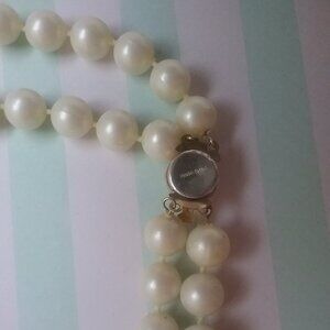 This is a lovely classic double string choker/style necklace made of acrylic faux pearl beads with continuous knotted string. The outer string hangs 8.5 inches from the clasp and is 18 inches in length. The shorter, inner string hangs 7.5 inches and is 15.5 inches long. The clasp is a classic slide style with a decorative bead topper to disguise it. The clasp has the word "Hong Kong" printed on the metal back. So, it fits almost like a choker and as a collarbone necklace.