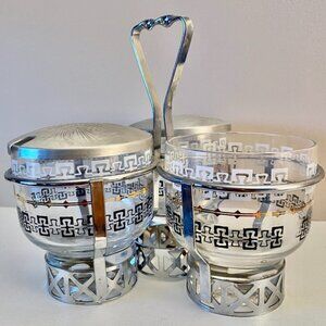 1960s vintage Libbey serving caddy with 3 serveware glasses, 2 lids, and holder for the 3 glasses. Can use for sauces or herbs and salt. Excellent vintage condition. Measures 3.5 inches tall, about 6.5 inches in diameter. Cat friendly, nonsmoking home.
