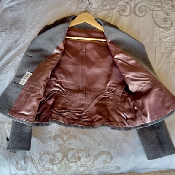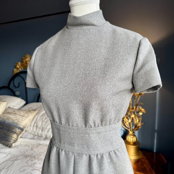 Vintage 1960s Miss Style Of Course for Fashionwise West Vancouver gray mock neck cap sleeve wiggle dress and suit jacket set, no size tag found bit fits like a S/2. Feels like wool/wool blend, blazer has a nice rose satin lining, dress has a light ice grey satin lining. Dress zips at back, blazer is button up. Great vintage condition, water mark and smudge on bottom of dress as shown in photos 10 & 11. Cat friendly, nonsmoking home.