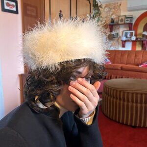 1960s White feather pillbox fascinator hat with lace top - from Ayres!