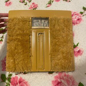 Tags: 60s vintage weight scale, mid-century modern weight scale, bathroom scale, 70s bathroom scale, 60s bathroom scale, furry bathroom scale, vintage bathroom scale, bathroom weight scale, yellow furry scale, vintage furry scale, retro bathroom scale, 1960s weight scale, vintage home decor, mid-century bathroom accessory, 70s home decor, vintage weight measuring scale, 1960s home decor, vintage weighing scale, decorative bathroom scale, vintage retro scale, retro bathroom accessory