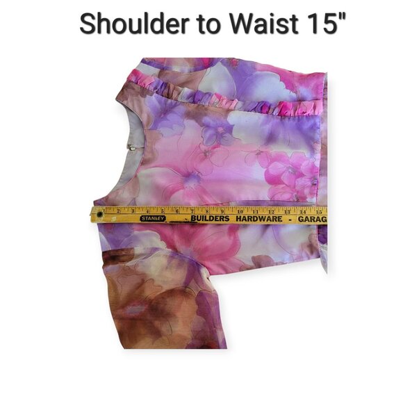 This vintage 1960s/1970s maxi dress features a pink and purple ruffled chiffon construction ideal for a range of formal events.