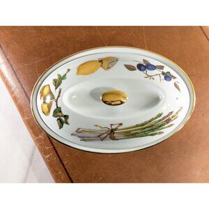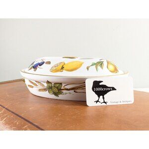 An iconic 9" Royal Worcester Evesham Gold lidded Entree dish with handles and lid knob. "Evesham Gold by Royal Worcester features assorted fruit still-life designs that look virtually lifelike. These designs are beautifully contrasted against a luminescent white background and striking gold trim - the result is an eye-catching pattern that's sure to draw compliments from every guest" .Copyrighted 1961, this fine Porcelain piece is marked Oven to Tableware, perfect for cooking and serving. Pretty and versatile, this would make a great housewarming or birthday gift, or why not gift it to yourself?