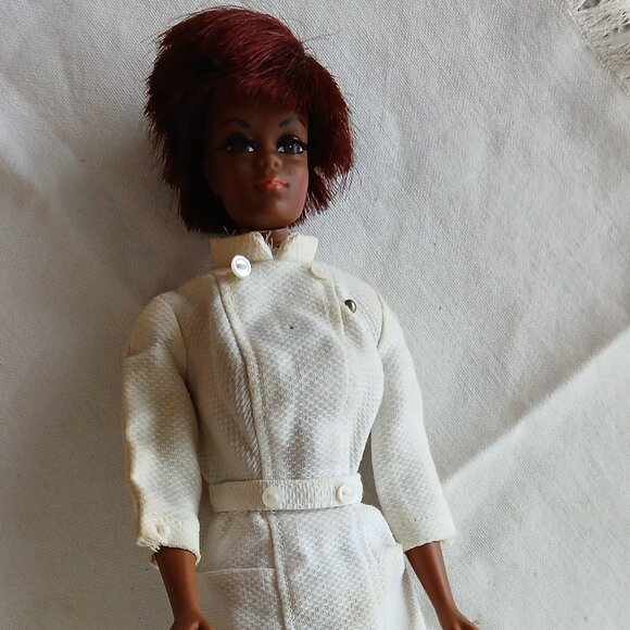 1970 original Barbie doll Nurse Julia, based on TV show "Julia" (1968-1971) played by actress Diahann Carroll. Her hair has oxidized to reddish. Very good vintage condition, please check all photos. Bendable legs & twist 'n turn waist. Made in Japan. This doll is recognized as one of the first (two prior to Julia) African American celebrity dolls in the Barbie Liine. 1969 has 2 pce uniform, 1970 has 1 pce uniform.