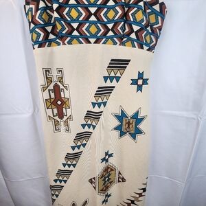 It features a geometric tribal style print, thick shoulder straps, slit in the back of the skirt, and a zipper closure on the back of the dress.