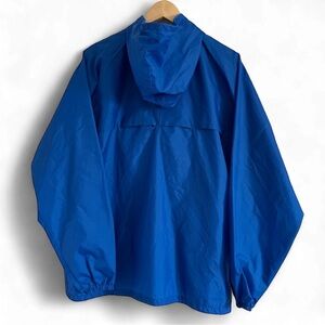 What a blast from the past. This vintage true blue windbreaker by Free Spirit has never been worn. Features a hood and a 1/3 front zipper with a front pocket that you can tuck the jacket into. Genius idea. You won’t be disappointed.