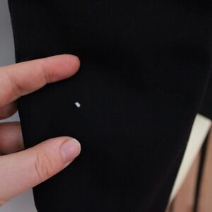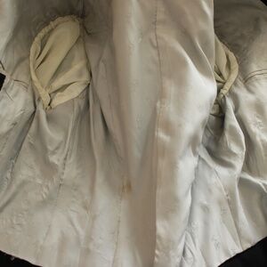 A late 1970s-80's Lord West brand black pinstripe tailcoat, in fair condition. There is some moth damage, and some staining to the wool as shown. The lining is grey polyester, the lapels are also polyester satin. The invisible thread on the cuffs is unravelling as shown.