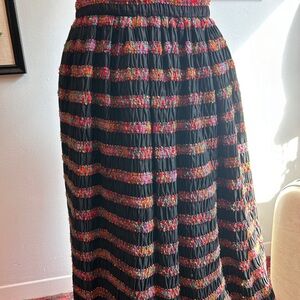This true 1970s gem from Canadian label Bilboquet features vibrant horizontal ribbon stripes stitched over a black base in a textured smocked pattern. The wide ruffled hem adds swing and dimension, giving it that perfect mix of folk-art whimsy and vintage drama.
