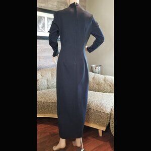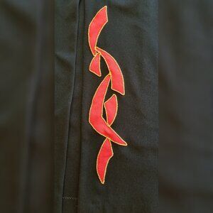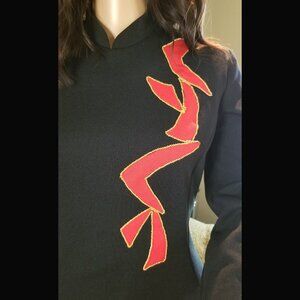 Sharp looking maxi gown from the 1970s. Black with striking red graphic appliques sewn on with gold metallic thread and thigh high slit to show off that leg! Nehru collar, long sleeves, and zippered back.