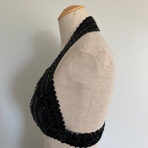 Super cool 70s halter top with disco vibes! It's made with a soft stretch woven type fabric that is covered with zig-zag rows of sequins on the right side. It's in excellent condition and would be fabulous under a blazer or as part of a dance ensemble. It simply slips over your head and stretches to fit. The tag says "M" but I would say it is more of a small be today's standards - the underbust unstretched is just 24" and it stretches to easily fit a 32/34 bust with cups stretching to fit most sizes. Made in CANADA by Colombine for Fashion Fit.