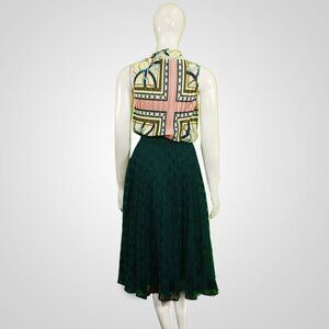 Imagine the allure of the past meeting the trends of today with this 1970s inspired vintage blouse. This piece features a nostalgic print that's both sophisticated and playful, embodying the freedom and artistic expression of the era. With a halter neckline and relaxed fit, it speaks volumes of the past while fitting seamlessly into the contemporary fashion scene. The detailed craftsmanship is a testament to the era's appreciation for quality and design. Pair it with a simple bottom to let the top shine, or layer it under a cardigan for cooler days. And to make your experience even sweeter, a complimentary jewelry gift accompanies your purchase.