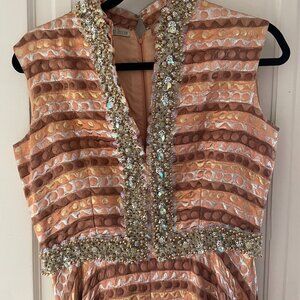 Gorgeous orange and gold/bronze/silver lamé polyester, heavily beaded plunging neckline.