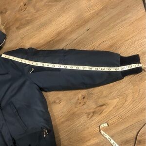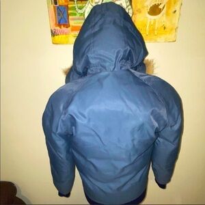 Excellent condition super warm winter coat jacket, shirt parka bomber - coyote trim hood… zipper zips almost all the way up for blizzard conditions, it hides your whole face if you need it too. Stuffed with ultra warm goose down, hood is trimmed with coyote fur, this coat has a large silver zipper also in excellent condition, and also has buttons to close, and a drawstring for the hood. lots of pockets. Good winter jacket to last you many many seasons, vintage Canadian snow gear holds up extremely well. Cozy and warm feels like you are wrapped in a cloud!